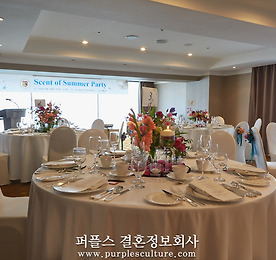 지난 6월 13일 ‘웨스틴조선호텔 부산’에서 퍼플스의 <Scent of Summer Party> 미팅 파티가 열렸습니다. 더욱이 사적인 만남을 위해 24명의 회원만이 참석하여 파티를 즐겨주셨습니다. 파티장은 화려한 색감의 센터피스를 사용하여 여름 분위기를 더욱 살렸으며, 전면 유리창을 통해 해운대 바다가 펼쳐져 회원들의 만족도가 매우 높은 곳이었습니다.