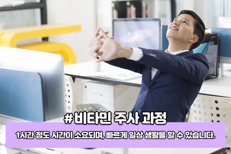 소요시간은 1시간~1시간30분 정도이므로 급하게 맞는 것보다는 푹 누워서 쉬는 느낌으로 받는 것이 좋으며, 바로 일상생활을 하는 데에 무리가 없으니 모두 맞은 후에 천천히 일상복귀하시기 바랍니다.