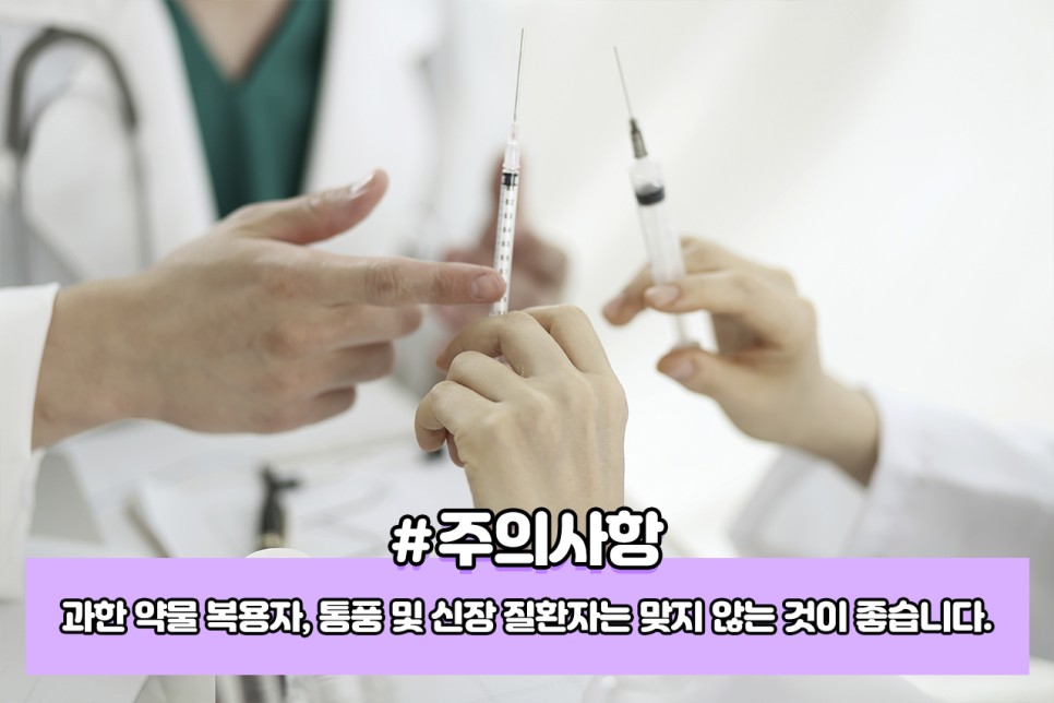 주의사항 아무리 면역력이 좋은 주사라 하더라도 맞지 않는 분들이 계실 수 있으나, 약물을 과다 복용하고 있어 비타민 주사와 만났을 때 부작용이 생길 수 있는 분, 통풍이 있는 분, 신장결성, 신장장애(신장) 기타 임신을 하고 있는 분이나 모유수유를 하고 있는 분은 추천드리지 않으니 참고하시기 바랍니다.