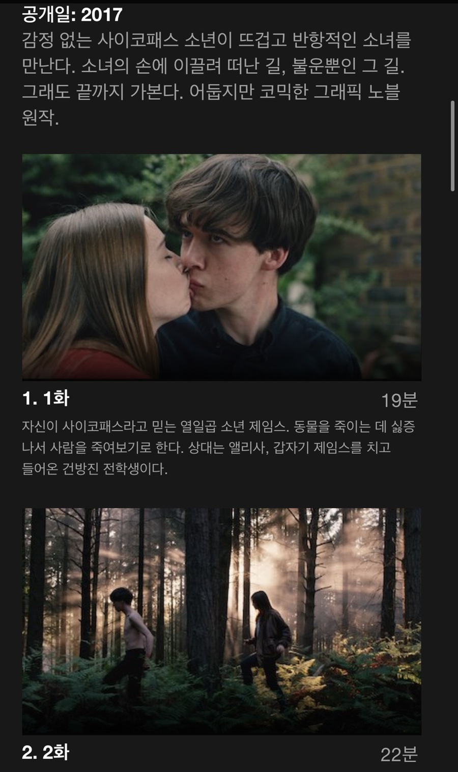 어떤 정보도 없이 보게 된 작품이지만 시리즈1은 정말 델머와 루이스가 떠오를 정도다.10대들, 그리고 요즘 델마와 루이스^^.(내 10대와 달라서 ㅎㅎ) 우리도 알고 있는 답답함, 답답함에서 벗어나고 싶은 충동을 실현하는 두 주인공들의 에피소드가 스릴러와 블랙코미디를 합친 것처럼 보이게 하고 주인공들이 서로 마음속의 대사를 번갈아 보여주는 재미가 독특하다.싸이코패스라고 생각하는 남주와 싸이코패스 같은 여주의 희망 같은 아버지를 찾으러 함께 떠나는 여정을 따라 떠나보자.