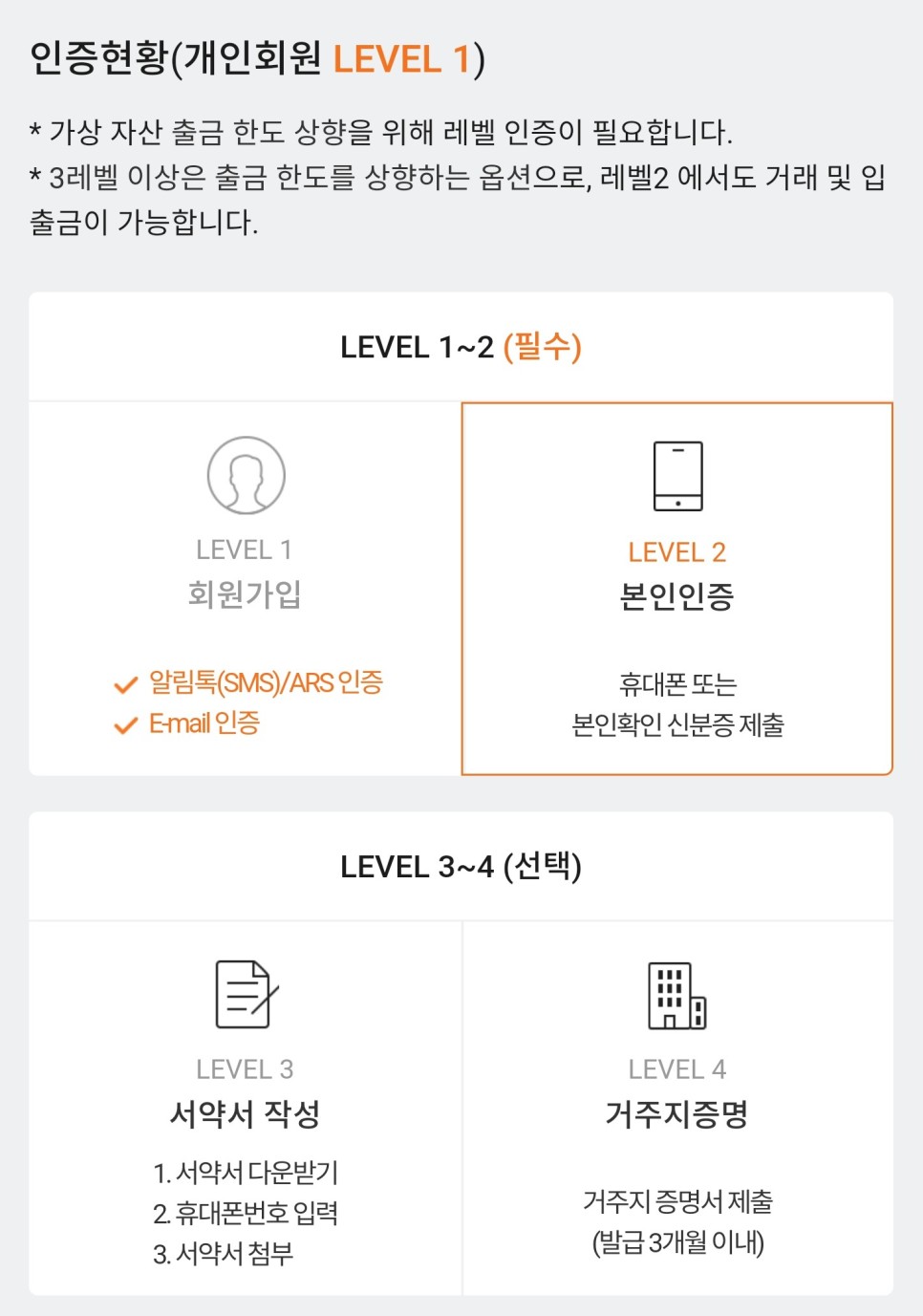 입출금을 위해서는 LEVEL2 본인 인증이 필요하다 휴대인증 또는 신분증을 제출할 수 있지만 휴대인증이 편해 휴대인증을 했다. 휴대전화 인증은 통신사, 전화번호로 실시하는 일반적인 것과 같다.