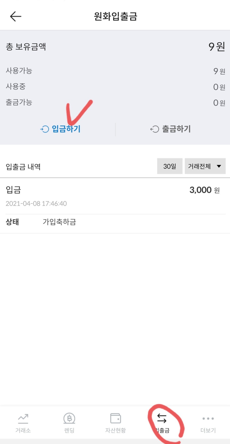 입금 방법은 아래에 ‘입금’을 눌러 ‘입금하기’를 누르면 된다. 그 다음에는 원화를 누르면 된다.