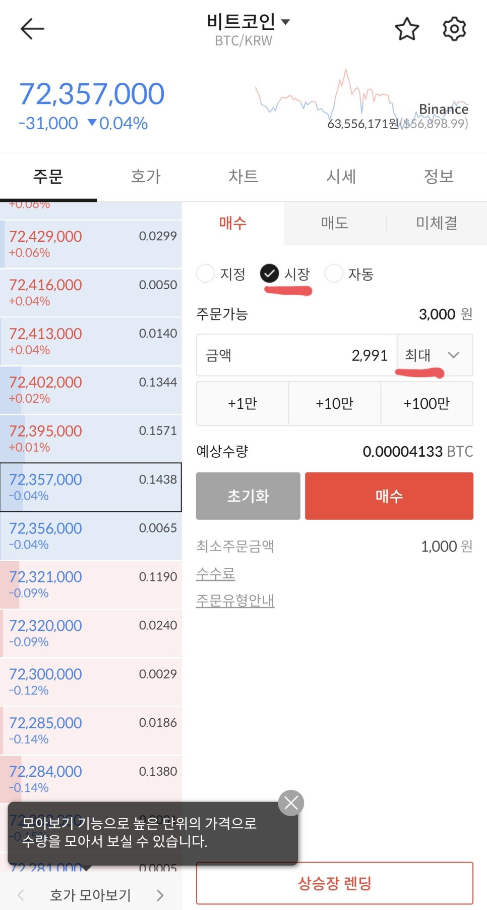투자할 가상화폐를 선택하면 이렇게 주문할 수 있다. 주식 거래와 많이 비슷하다. 지정가, 시장가를 선택할 수도 있다. 자동이 뭔지 잘 모르겠어. 지정은 최소 주문금액이 500원이지만 시장은 최소 주문금액이 1,000원이라는 차이가 있다.