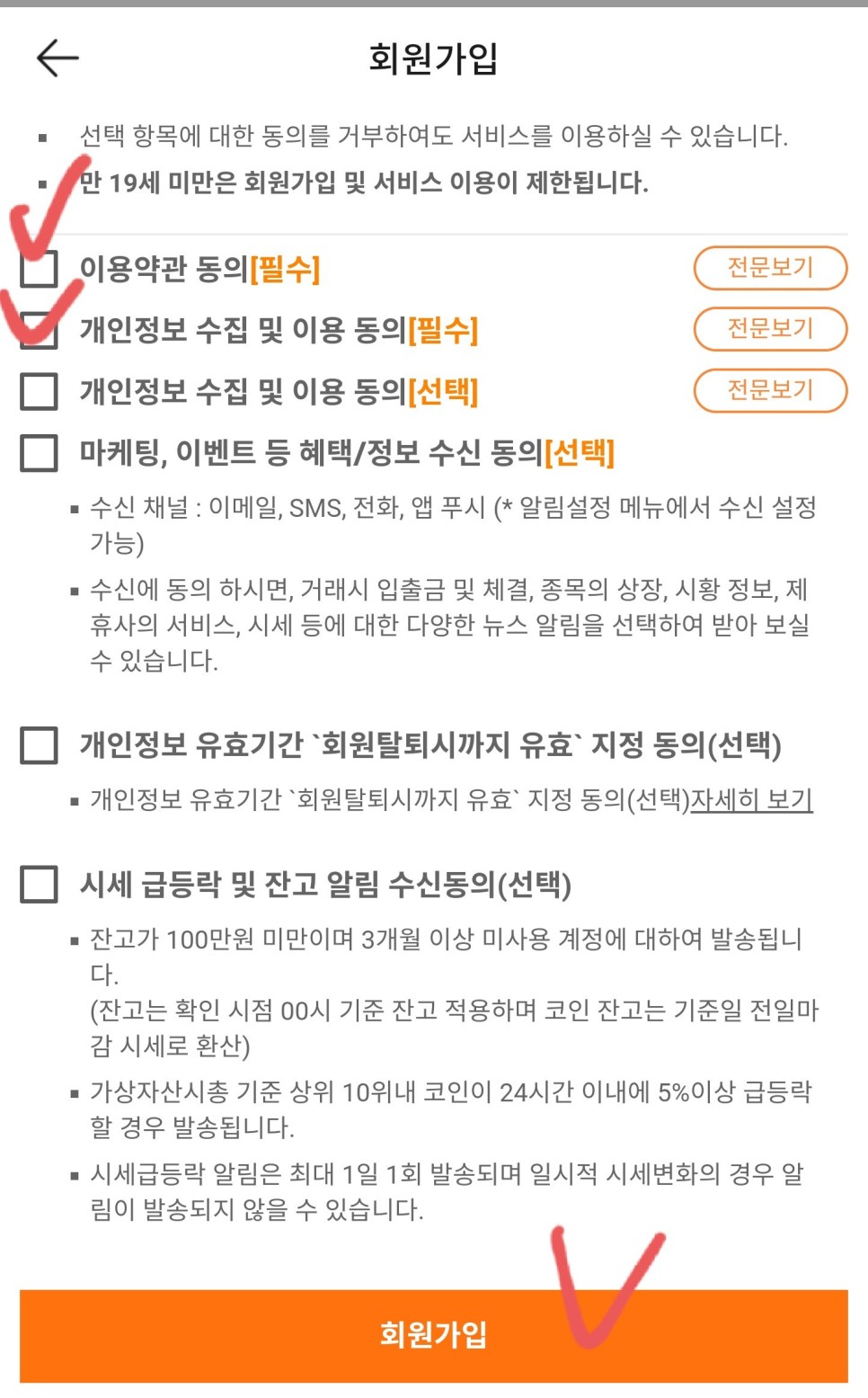 그리고 이용약관에 동의하고 ‘회원가입’을 누르면 끝이다. 본격적으로 투자하기 위해 가입한 것이 아니라 가상화폐 시장이 어떻게 움직이는지 궁금해서 가입했기 때문에 시세의 요동침을 알리는 선택적 동의는 체크하지 않았다.