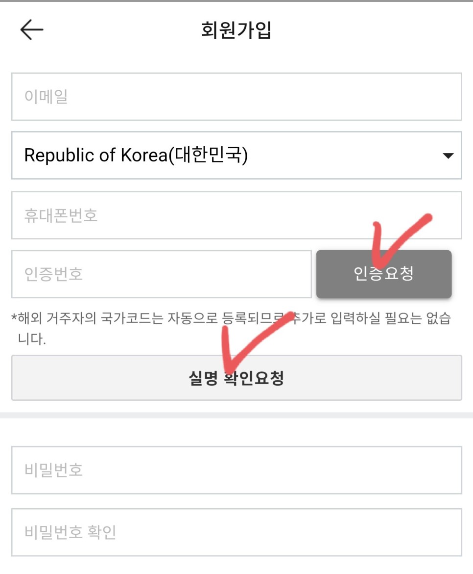 빗썸 가입은 일반 사이트 가입과 큰 차이가 없다. ‘신규 회원가입’을 클릭하고 이메일, 휴대폰번호를 기입하여 ‘인증요청’을 한 후 인증번호를 기입한다. 그리고 실명확인 요청을 해 비밀번호를 작성하면 된다.