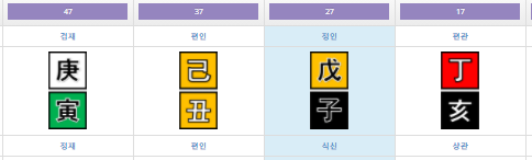 근데 사주에서는 불과 흙이 보이지 않습니다.10년마다 들어오는 대운을 보면…. 흙은 46살까지 보충되어 있기 때문에…다행이지만 불은 안들어옵니다.