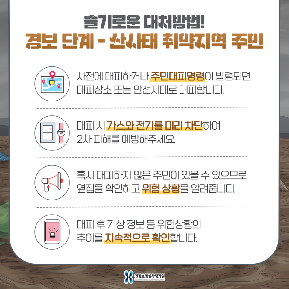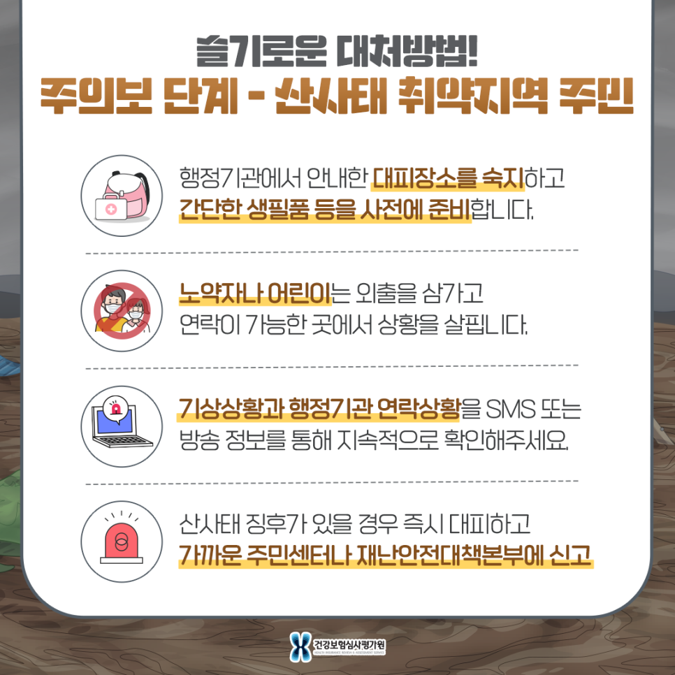 - 2) 진행별 행동요령 산사태 취약지역 주민(주의보단계)- 산사태 취약지역 주민은 대피를 준비하고 행정기관에서 안내한 대피 장소를 미리 숙지하여 간단한 생필품 등 사전준비를 합니다.- 노약자 및 어린이 외출은 자제하고 전화로 연락할 수 있는 장소에서 상황에 주의하십시오.- 경사면에서 물이 뿜어져 나오는 등 산사태의 징후가 있을 경우 즉시 대피하고 인근 주민센터나 시구 재난안전대책본부에 통보하세요.- 기상상황 및 행정기관 연락상황을 SMS 또는 방송정보를 통해 지속적으로 확인하시기 바랍니다.