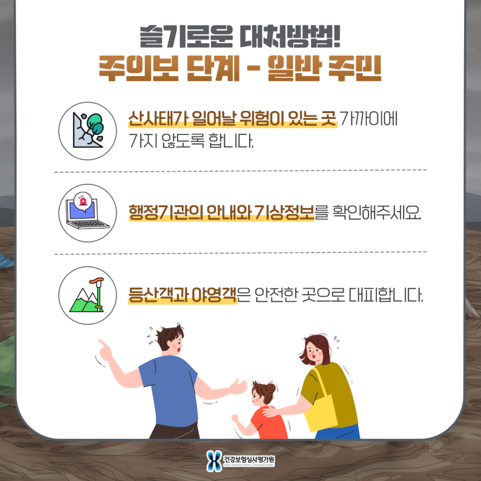 - 일반주민(주의보단계) – 산사태가 날 위험이 있는 곳에 접근하지 마세요. – 등산객 또는 산간계곡 야영객은 안전한 곳으로 대피합니다.- TV, 인터넷, 라디오를 통해 기상정보를 확인하고 관계 행정기관의 안내에 귀를 기울입니다.