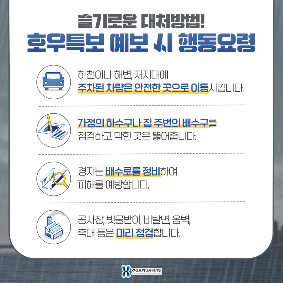 - 호우특보 예보 시 (1) 하천이나 해변, 저지대에 주차된 차량은 안전한 곳으로 이동합니다.(2) 가정 하수도나 집 주변의 배수구를 사전에 점검하고 막힌 곳은 배수로를 정비하여 피해를 예방합니다.(4) 공사현장, 주변 배수로, 빗물받이, 경사면, 옹벽, 옹벽 등은 사전에 점검하여 주십시오.