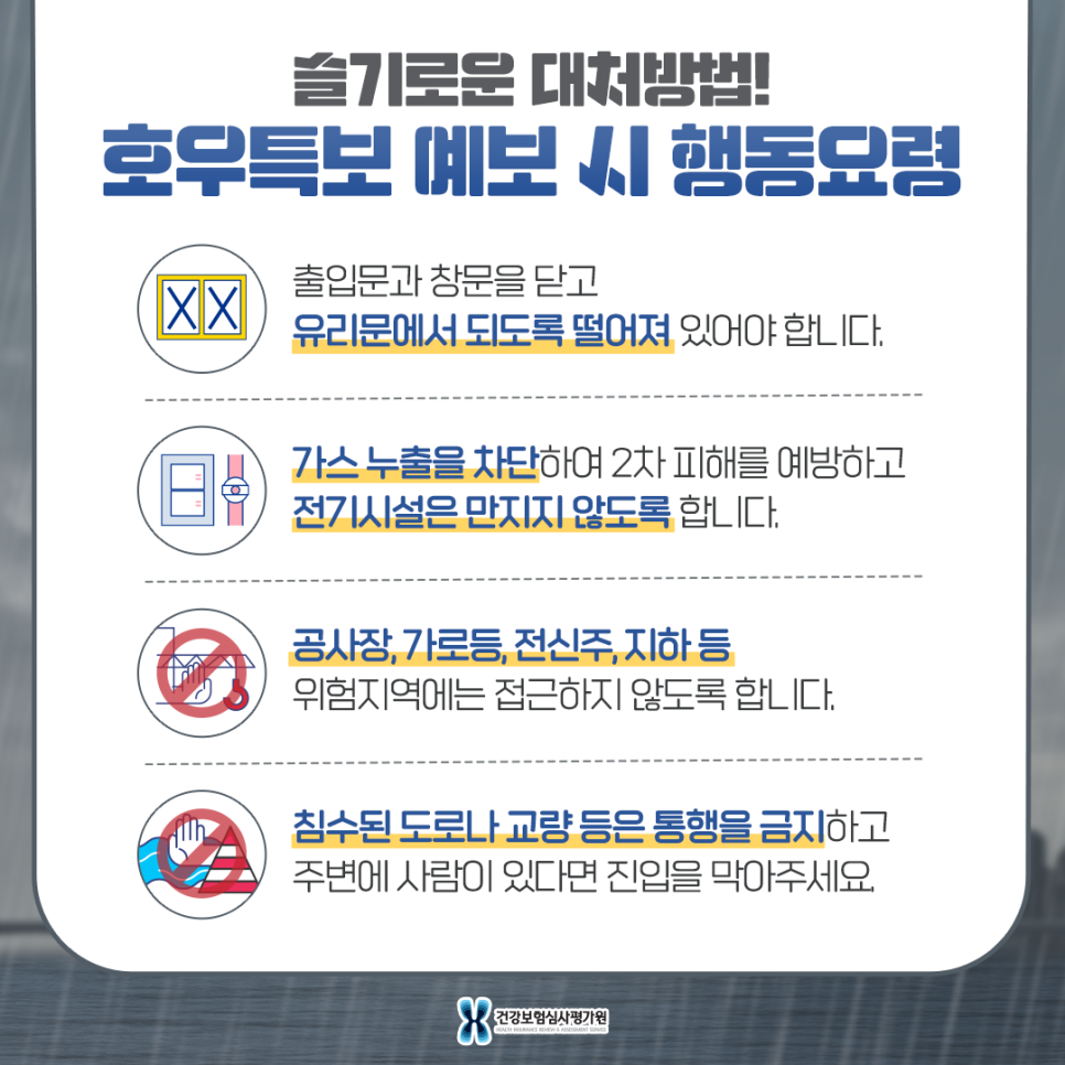 - – 호우특보 중(1) 건물 출입구, 창문은 닫아 파손되지 않도록 하고 창문이나 유리문으로 최대한 떨어져 있어야 합니다.(2) 가스누출로 2차 피해가 발생할 수 있으므로 사전에 차단하고 감전의 우려가 있는 집 안팎의 전기시설은 만지지 마십시오.(3) 공사현장, 가로등, 신호등, 전신주, 지하공간 등 위험지역에 접근하지 않습니다.(4) 특히 침수된 도로, 지하차도, 교량 등은 차량통수를 금지합니다.