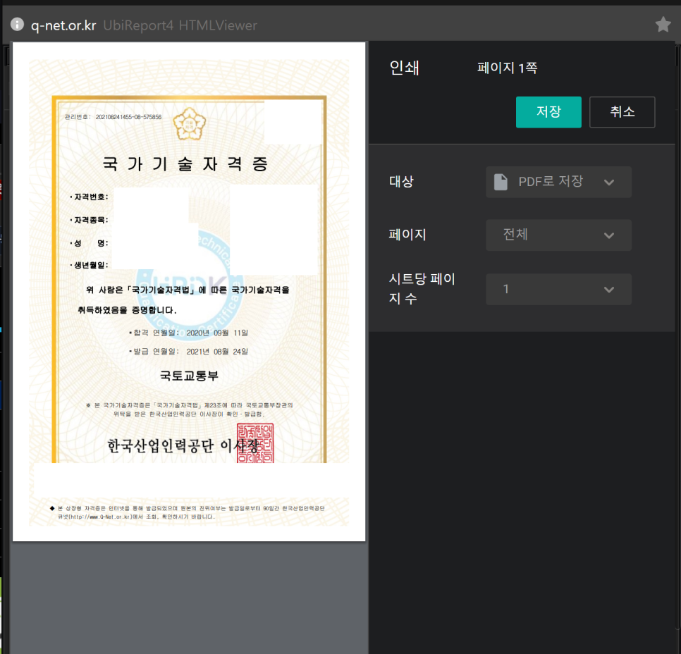 국가자격증(기사/기능사/산업기사 등)의 상장형(PDF)파일 출력 방법