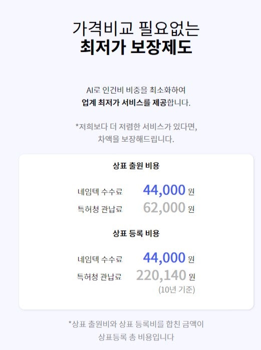 최초 수수료를 1만원 내면 5분 만에 상표등록을 진행할 수 있습니다. 상표등록 진행이 시작된 후 최종적으로 성공한 경우에만 네임텍 상표에 성공수수료 29만원을 추가로 지불하는 규칙! 등록에 성공하면 총 30만원입니다~ (+ 관납금액 별도)