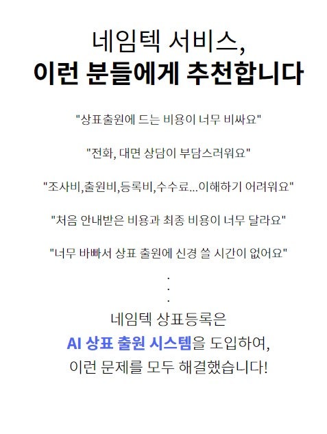 요즘은 상표로 화제가 많죠. 상표 출원이 많아지기 시작하면서 상표 등록을 빨리 하는 것이 중요해지고 있습니다. 상표등록절차가 복잡하고 머리가 아프고 겹칠까봐 헷갈릴때도 있어서 곤란하잖아요~ 그럴때 쉽게 상표등록이 가능한 네임텍 상표를 소개해드릴게요:)