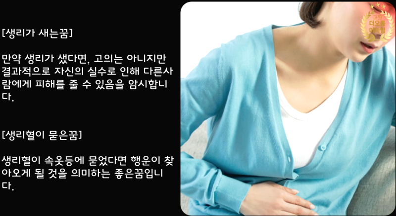 소변에 생리가 섞여 나오는 꿈에 따라 하는 일마다 순탄치 않고 시간과 노력만을 소비하는 것을 뜻하는 해몽입니다.임신 중인 여성이 생리하는 꿈 평소 원하던 것을 귀인의 도움을 받거나 자신의 힘으로 추진하는 과정에서 두 가지를 동시에 성공하는 것을 의미하는 해몽입니다.남성이 생리하는 꿈 혼자서 해결하기 어려운 일에 대해 누군가에게 협조를 요청하고 도움을 받는 것을 뜻하는 해몽입니다.타인이 생리하는 꿈의 문제점을 해결하는 방법이 생기거나 진행 중인 일을 성공시킬 수 있는 방안을 찾는 것을 의미하는 꿈꿈꿈의 꿈입니다.제가 생리하는 꿈복권에 당첨되거나 뜻밖의 재물이 들어오는 등 횡포가 되는 것을 뜻하는 해몽입니다.생리량이 많은 몽귀인 또는 주변의 도움을 받아 직장에서 승진하거나 사업체가 확장되는 것을 의미하는 몽몽몽점입니다.딸이 생리하는 몽귀인의 도움을 받아 사업자금이나 생활이 넉넉해지는 것을 뜻하는 해몽입니다.초경하는 꿈의 귀중품을 잃거나 협력자를 잃는 것을 의미하는 꿈의 해몽입니다.생리혈을 꾸는 꿈, 누군가와 헤어지거나 자신을 지지하고 도와준 사람이 배신하는 것을 의미하는 해몽입니다.생리하는 것을 꾸는 꿈 새로운 정보를 습득하거나 자신을 도와줄 협력자나 동업자를 만나는 것을 의미하는 해몽입니다.성관계 중 생리가 나오는 꿈 사소한 말다툼이 결국 큰 싸움으로 번지는 것을 의미하는 해몽입니다.폐경인데도 생리하는 꿈 진행되고 있는 것이나 사건을 신속하고 명쾌하게 처리하게 된다는 것을 의미하는 해몽입니다.처음 생리하는 꿈 공공기관이나 거래처에 부탁하는 일이 많아진다는 것을 의미하는 해몽입니다.몸에 생리혈이 묻어나는 꿈 주위에서 일어나는 새로운 소식이나 뉴스를 접하는 것을 의미하는 해몽입니다.생리통이 심한 꿈 가정이 화목해지고 사업이 번창함을 뜻하는 해몽입니다.성관계를 해야 하는데 생리가 터지는 꿈도 멀지 않아 훌륭한 배우자를 만나 결혼하는 것을 의미하는 해몽입니다.생리가 옷에 묻을까 걱정하는 꿈의 성공이 눈앞에 있지만 방해 요소가 너무 많아 더 많은 노력을 하게 된다는 것을 의미하는 꿈의 해몽입니다.생리가 새지 않을까 걱정하는 꿈의 일을 진행하는 과정에서 어려움이나 문제점이 발생하여 정신적인 고통을 받는 것을 의미하는 꿈꿈의 꿈 꿈입니다.생리가 흘러나와 주변을 붉게 물들이는 몽운수가 대통해 많은 재물과 돈이 생기고 모든 일이 소원대로 성취됨을 뜻하는 몽몽몽점입니다.생리가 많이 나오는 꿈, 생리가 넘치는 꿈 부진했던 사업이나 일이 어느 순간에 번창하거나 제대로 진행되는 것을 뜻하는 해몽입니다.여성이 생리하는 꿈의 고민이나 문제점을 해결하는 방법을 얻어 자신의 소원을 차례로 성취하는 것을 의미하는 꿈 꿈의 꿈 꿈입니다.생리가 옷에 묻은 꿈, 생리혈이 옷에 묻은 꿈의 라이벌이나 문제점을 제거하고 자신의 소원을 무난히 달성하는 것을 의미하는 꿈의 꿈입니다.생리가 새는 꿈의 집에 필요한 생필품이 생겨 편리한 생활을 하거나 약간의 재물을 얻는 것을 의미하는 꿈의 해몽입니다.생리가 멈추지 않고 계속 나오는 해몽에 뜻밖의 문제점이나 어려움이 생겨 주어진 시간 내에 일을 끝낼 수 없게 되는 것을 뜻하는 해몽입니다.생리의 피가 더럽고 지저분하게 느껴지는 꿈 주변의 환경을 청결하게 하는 등 새로운 마음가짐으로 생활에 임하는 것을 의미하는 해몽입니다.생리가 내 몸을 타고 흘러내리는 꿈의 희망이 밝아지고 모든 소원이 만족스러워짐을 의미하는 꿈 꿈 꿈 꿈 꿈입니다.생리가 붙어서 닦고 씻는 꿈을 꿀 때마다 행운이 따르고 기분 좋은 일이 일어나 귀인을 만나는 것을 뜻하는 해몽입니다.생리통으로 배가 아픈 꿈 미혼 남녀라면 사랑하는 사람을 만나는 것을 의미하는 해몽입니다.생리가 걸레에 묻은 것을 꾸는 꿈의 장애물을 극복하고 서로 만나 더 큰 사랑을 키우는 것을 뜻하는 꿈의 해몽입니다.폐경이 되는 몽종교나 학문 등에서 널리 명성을 날리는 것을 뜻하는 해몽입니다.소변을 보는데 생리가 따라오는 꿈을 꾸는 일이 모두 순조롭게 진행되어 조만간 소원을 이룰 것을 뜻하는 해몽입니다.생리가 멈추지 않는 꿈을 꾸는 것이 도중에 좌절되거나 간절한 소원이 이루어지지 않거나 주변에 나쁜 소식만 들리게 되는 것을 뜻하는 해몽입니다.