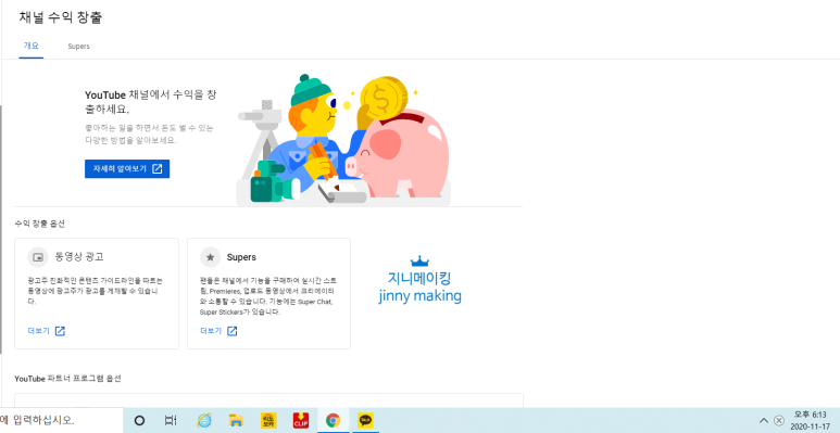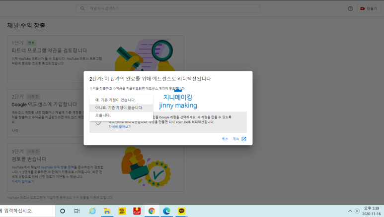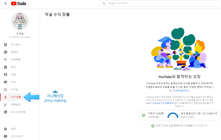 드디어 딸 Jinny가 2020년 11월 16일 수익 창출 조건 1년 이내 구독자 1,000명, 시청 시간 4,000시간 달성한 날!