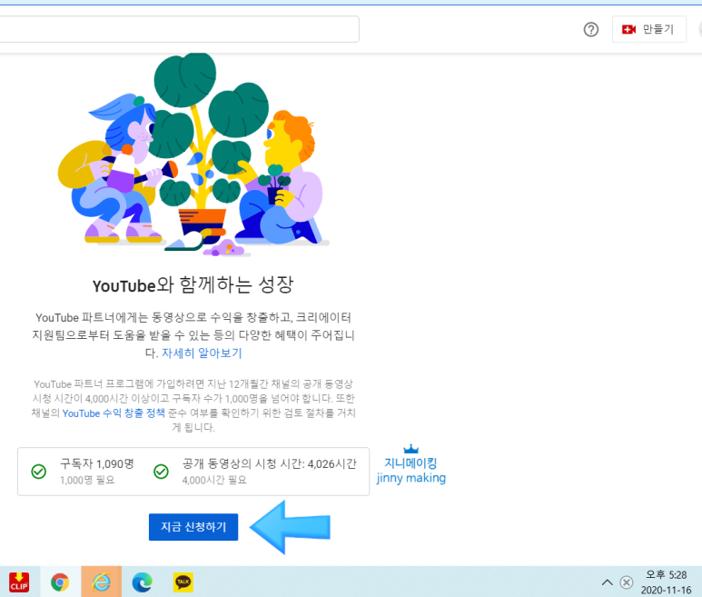 화면과 같이 지금 신청 버튼이 활성화 됩니다.유튜브 시청 시간은 이틀 전에 시간이 최종적으로 반영되었습니다!11월 15일 4,000시간에서 7시간이 모자라서 신청을 못하고 있습니다.(눈물)