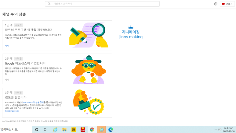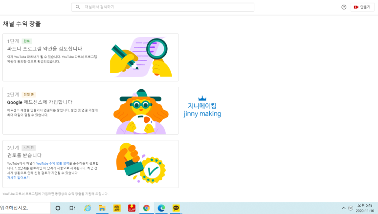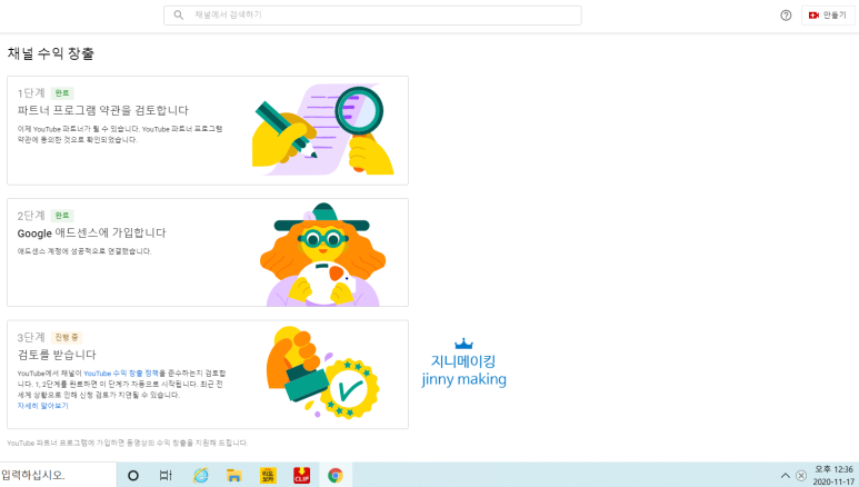 유튜브 스튜디오에 수익창출 탭을 클릭하시면 최종 확인하실 수 있습니다.채널 수익 창출 과정은 총 3단계를 거치게 되네요