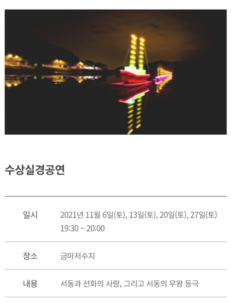 서동공원?익산시 금마면 고도9길 41-14✔서동축제 기간: 11/6~11/28