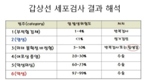 갑상샘세포 검사 결과는 베데스다 단계에 따라 1~6단계로 결과가 나오지만 나는 애매한 4단계였다.4단계라면 보통 반복 검사 또는 생검을 한 뒤 암으로 판정받은 뒤 수술하는 추세다.