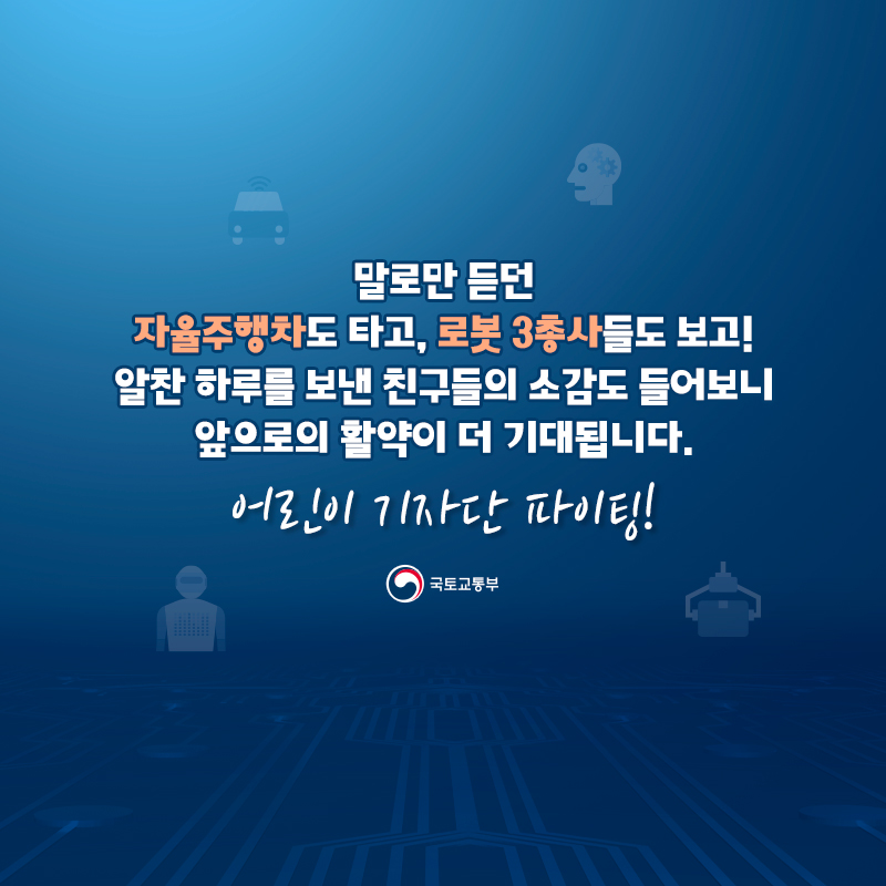 소문으로만 듣던 자율주행차도 타고 로봇 3총사들도 보고! 알찬 하루를 보낸 친구들의 소감을 들으니 앞으로의 활약이 더 기대됩니다어린이 기자단 파이팅!