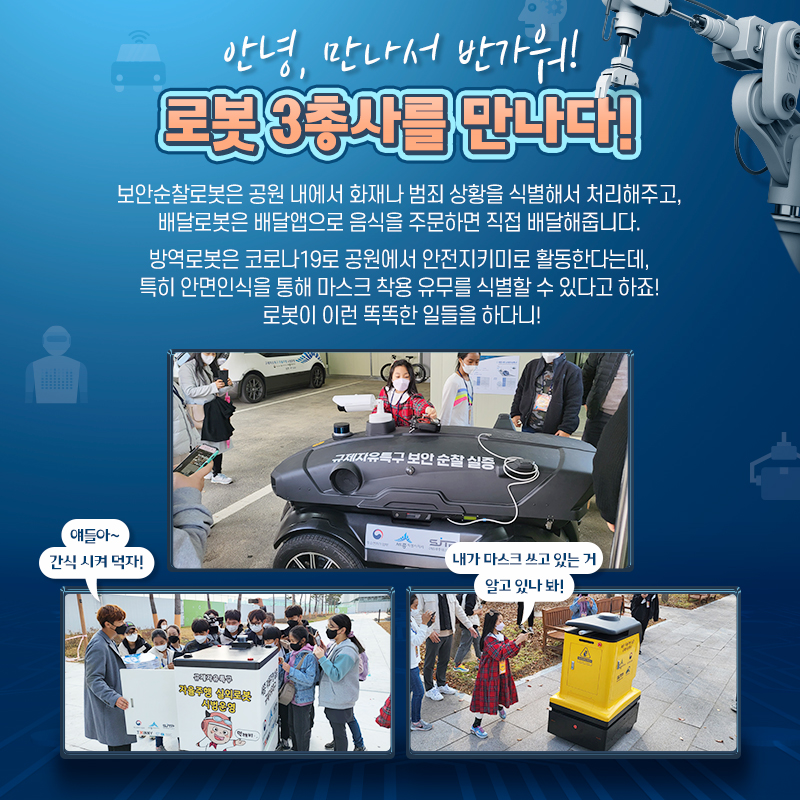 보안순찰로봇은 공원 내에서 화재 및 범죄상황을 식별하여 처리해주고, 배달로봇은 배달앱으로 음식을 주문하면 직접 배달해줍니다.