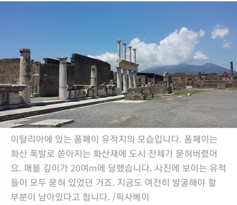 서기 79년에 이탈리아 남부 나폴리 연안에 높이 솟은 베수비오 화산이 갑자기 폭발했습니다. 검은 구름이 분출하여 화산이 용암을 내뿜으며 분화를 하기 시작했습니다. 엄청난 양의 화산재와 뜨거운 흙과 돌 같은 화산 분출물이 비오듯 쏟아져 내려 산 아래 있던 폼페이 시를 순식간에 덮쳤습니다. 화려한 궁궐을 비롯한 도시 전체가 매몰되면서 안타깝게도 당시 인구의 10%인 2000여명이 열에 타 죽거나 질식했을 것으로 추정됩니다.