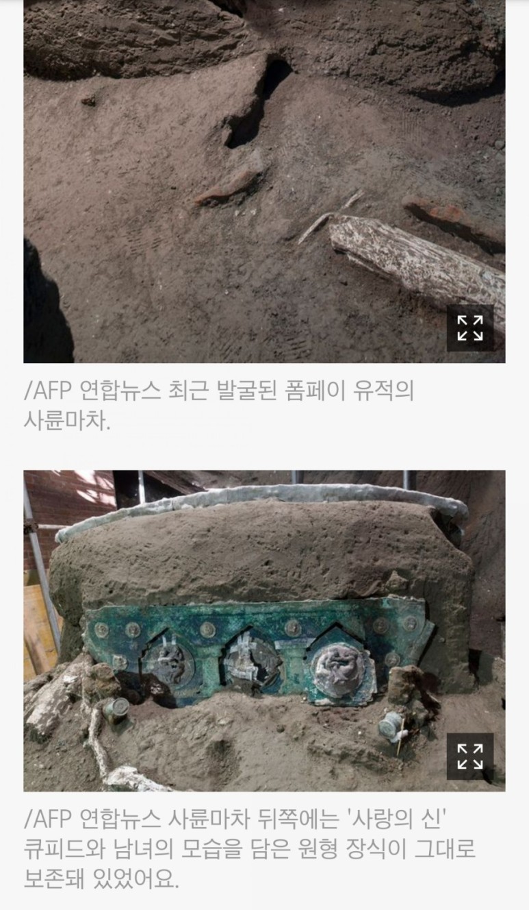 마차 뒤에 달린 아름다운 어린이 모양의 장식은 그리스 로마 신화에 등장하는 사랑의 신 큐피드로 추정됩니다. 그런데 말입니다. 놀라운 것은 사륜마차가 화산재에 파묻힌 지 2000여 년이 지났는데, 최근에 만든 것처럼 멀쩡했다는 것입니다. 그 옛날 무슨 일이 있었기에 2000년 만에 아름다운 사륜마차가 지상에서 나타났을까요?◇화산 폭발로 도시가 순식간에 매몰되었습니다.