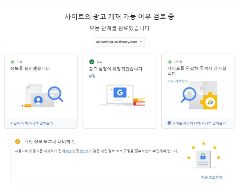 승인 후 구글 어드센스 홈으로 돌아가면 다음과 같은 화면으로 바뀝니다.