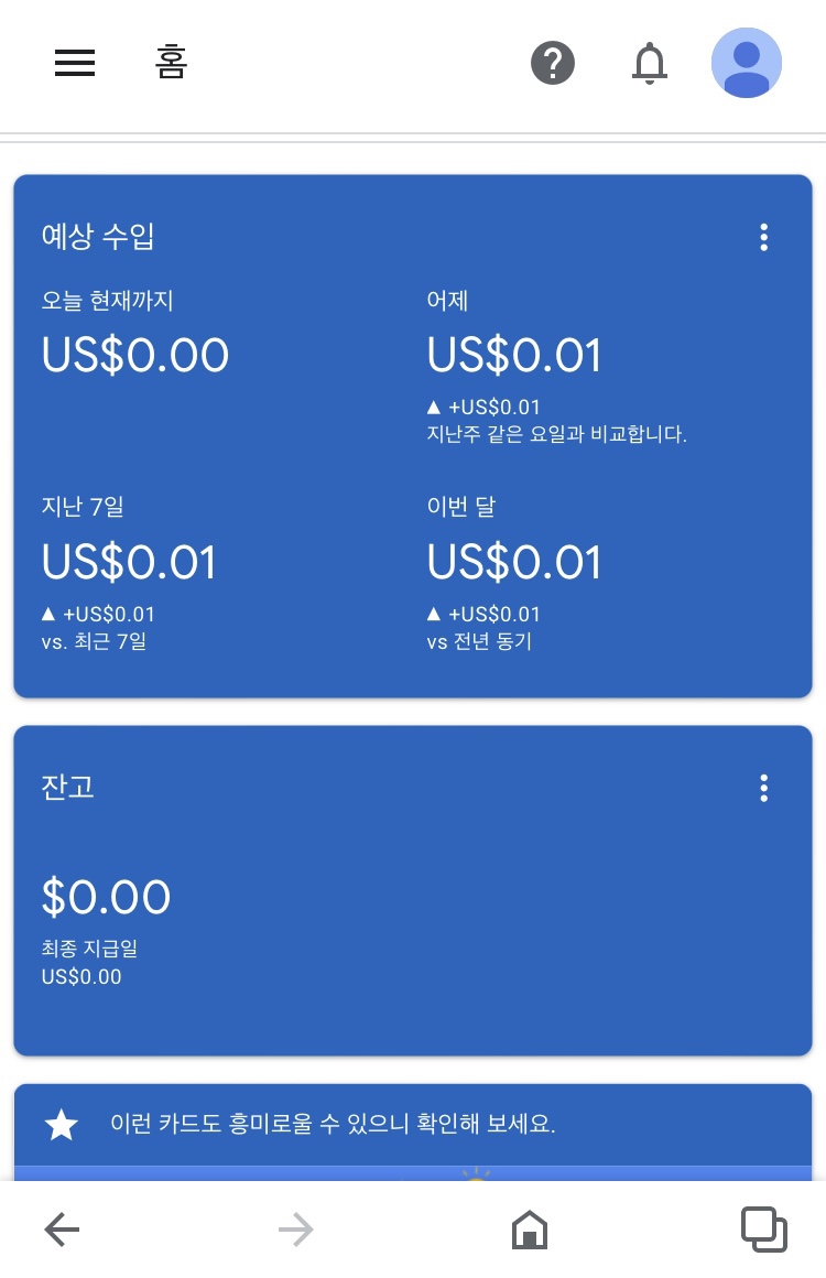 하루가 지난 후 오늘 들어가 보니 0.01$가 표시되어 있네요.