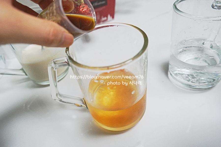보통 편도염에 걸리면 따뜻한 물 정도만 마시는데~ 앞으로는 이렇게 시럽을 섞어서 마시면 좋지 않을까 싶어요.