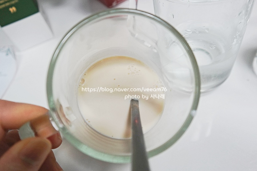 편도염이 좋은 음식은 고무 배추 시럽이기 때문에 우유로도 금방 섞을 수 있습니다.너무 많이 넣지 않아도 돼요.우유량은 대략 100밀리리터 정도입니다, 여기 시럽은 1:3 정도로 희석해 보았습니다.