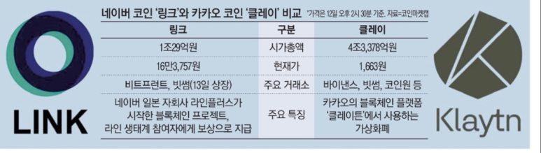 네이버 관계사 라인이 발행하는 것은 코인 링크의 한국거래소 상장은 향후 블록체인 시장에서 펼쳐질 네이버와 카카오 간 진검승부의 시작이다. 일본과 미국을 중심으로 활동하던 라인이 본격적으로 국내에 도전장을 내밀었다. 카카오도 최근 해외사업 확대를 위해 그동안 자회사 그라운드X가 주도해 온 블록체인 사업을 싱가포르 법인 크라이튼 재단에 넘기겠다고 밝혔다.링크는 라인이 주도하는 블록체인 프로젝트와 연계된 동전이다. 고객이 라인의 다양한 서비스를 사용하는 보상 개념으로 코인을 받는다. 일본과 동남아시아에 정착한 아린 플랫폼의 영향력에다 각종 해외 경험 등이 라인블록체인 생태계의 강점으로 꼽힌다.