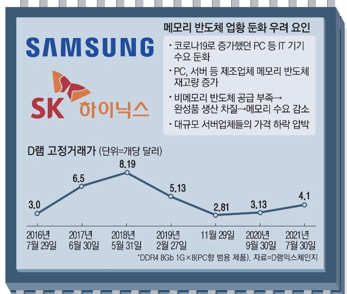 의견1: 부정적 견해=최근 일부 메모리 반도체 현물가격이 하락하면서 메모리 반도체 호황이 정점을 넘어선 것 아니냐는 우려가 나오고 있다. 상반기 메모리 호황을 불러온 것은 코로나19 사태였다. 그러나 하반기 들어 PC나 PC 등 정보기술 기기의 수요가 다소 둔화되면서 완제품 업체의 메모리 반도체 재고량이 증가했다는 분석이 제기되고 있다. 한편 국내 반도체업계에서는 메모리 반도체에 대한 수요는 여전히 견고해 일부 시장조사기관과 투자자를 중심으로 반도체 경기후퇴에 대한 공포심이 지나치게 확산됐다는 평가도 내놓았다. 올해 4분기 PC용 D램 가격이 전 분기에 비해 최대 5%가량 하락할 것으로 전망됐다. 44분기부터 D램 가격 상승세가 하락세로 돌아설 것으로 전망했다.대만 시장조사업체 트렌드포스 보고서는 PC업체들의 D램 재고수준이 높아지는 등 D램 시장이 점차 초과공급 상태로 바뀌고 있다며 코로나19 규제가 완화되고 PC 및 노트북PC 수요가 감소하고 있어 D램 가격 하락에 영향을 미칠 것이라고 예상했다. 또, 메모리의 피크에 대한 염려가 계속 되고 있다.이 밖에도 비메모리 반도체 공급 부족으로 전자기기 완제품 생산에 차질이 생겨 메모리 수요 감소로 이어지고 있다는 분석이다.또 서버를 운영하는 하이퍼스케일급 대규모 서버업체들이 가격 협상력을 바탕으로 가격 하락을 압박하고 있다는 분석도 있다.의견2: 긍정적 견해=그러나 국내 반도체 업체들은 이 같은 전망이 일부 제품군의 사례에 기인하는 지나친 우려라는 입장이다. 일반적으로 애플 아마존 등 주요 메모리 반도체 고객사들은 분기 단위로 계약을 한다. 이때 사용되는 고정거래가에 큰 변동이 없는 상황에서 소매가격에 해당하는 현물가격의 하락만으로 전체 추세를 전망하는 것은 지나친 확대 해석이라는 것이다. 실제로 업계에 따르면 이미 하반기 메모리 반도체 계약은 상당수 완료된 것으로 알려졌다. 또 재고 증가도 우려할 만한 수준은 아니라는 분석이다.의견3: 부정적 시각=모건스탠리는 메모리 겨울이 오고 있다라는 보고서에서 D램 업황이 활력을 잃고 있다며 삼정의 목표주가를 98,000→89,000으로 하향 조정했다. SK하이닉스의 목표가격을 156,000~80,000으로 절반가량 낮춰 투자의견을 비율 확대-비중 축소로 수정했다. 또 한국의 기술산업 전망에 대한 의견도 중립 ->주의로 조정했다. 모건스탠리는 반도체 업황이 2019년 이후 처음으로 확장 사이클 후반기에 접어들었다고 설명했다.국내 증권사에서도 목표가격을 낮춘 보고서가 나왔다.의견 3: 긍정적인 견해지만 이 같은 우려에도 불구하고 대부분의 증권사는 중장기적으로 삼성전자와 SK하이닉스가 매력적이라고 평가했다. 현재 삼정과 SK하이닉스의 주가는 중장기적으로 밸류에이션의 매력이 큰 상태라고 판단된다고 말했다.