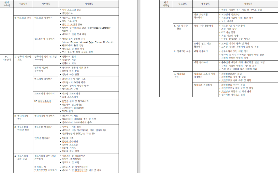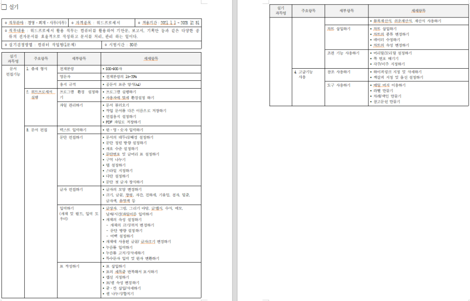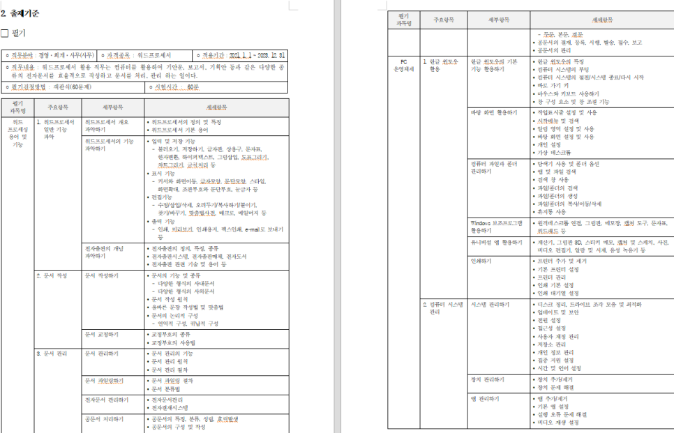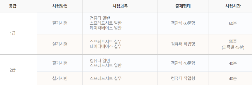 위는 각각 등급별 필기 실기 과목의 내용인데요.