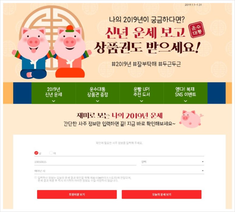2019 무료 새해 점쟁이들이 책을 주문할 때 자주 이용하는 ‘Yes 24’에서도 새해맞이 무료 점성 서비스를 제공하고 있었습니다.새해 운세도 보고 이벤트도 있는 것 같습니다만, 저는 운세만 신경 쓰여서 간단하게 이름과 태어난 해, 월, 시를 입력해 보았습니다. 옛날에는 이런 토정비결점 서비스를 한 번 보고 5천원 정도 내야 했는데 세상은 참 좋아졌어요.(?) 예스24에서는 간단한 정보를 입력하면 토정비결하고 오늘의 운세를 볼 수 없지만 새해를 맞아 운세를 전반적으로 보기 위해서는 “토정비결”이 더 좋을 것 같아요.이곳을 포함해서 서너군데서 보고있었기때문에 전반적으로 비슷해서 기분이 좋습니다. 올 한 해 순조로울 것 같습니다www