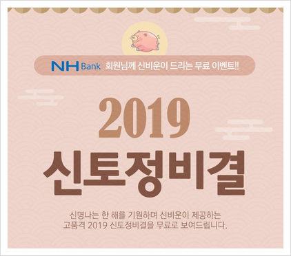2019 무료 신년운세 NH농협생명에서도 2019년 무료 신년운세 서비스를 제공하고 있습니다.작년에는 여기서 잠깐 봤는데 운세 결과를 꽤 자세히 볼 수 있어서 참고할 만한 내용이 많은 것 같아요 음양오행에 대해 조금이라도 안다면 결과를 더 깊이 볼 수 있을 것 같군요!:) 작년보다 볼 수 있는 운세가 더 늘어난 것 같아서 하나하나 결과를 보는 재미가 많이 있었습니다.농협에서 나온 결과도 올해는 운수가 좋으니까 어떤 선택을 해도 자신의 의지에 따라 물 흐르듯 따라가면 좋은 결과가 있다고 하더군요. 진짜 그랬으면 좋겠다ㅠㅠ ㅠ
