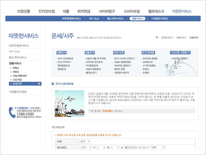 마지막으로 신한생명에서도 2019 무료 새해 운세 서비스를 제공하고 있습니다.농협과 신한운세서비스의 결과를 잘 알고있지만, 운세서비스를 제공하는 회사가 같은 것 같네요.:) 위의 이미지를 클릭하시면 해당 운세 페이지로 이동할 수 있는 신년운세 외에도 생명보험사 에서는 재물이나 투자운도 있으니 올 한해 경제 흐름을 알고 싶으신 분들은 참고해보세요!!직장, 대인관계, 전직, 금전, 시험, 건강전반적으로 다 좋다고 하니 좋지만, 뭐 어디까지나 운세는 참고만 하고 재미로 보는 거니까) 올 한해는 왠지 잘 될 것 같은 기분이네요!!