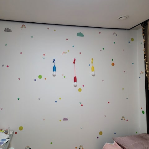 In primo luogo, invece di fare carta da parati con uno schema ovunque, sarebbe meglio costruire carta da parati con un modello o un disegno sul lato del letto o sulla scrivania. E se lo schema non è troppo affollato e scegliete un prodotto calmo, avrà un effetto di wallpaper interno. Sembra che l’illustrazione dei tre polli, che è anche carina nello spazio sopra, abbia perfezionato la decorazione murale della stanza dell’I-B-B-B-B.