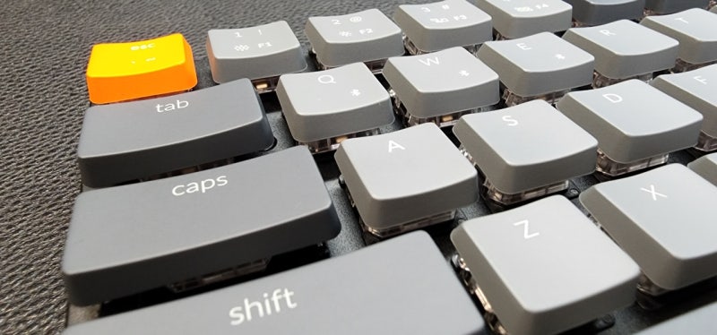 ESC를 보면 키크론의 상징처럼 보이는 오렌지색 포인트 키캡이 눈에 들어옵니다. 언제봐도 예쁘고 기쁜 색이네요. 물론 이 포인트를 싫어하는 분이라면 동봉된 그레이 ESC 키캡으로 변경하여 이용하셔도 좋습니다.
