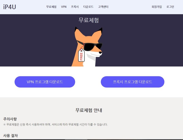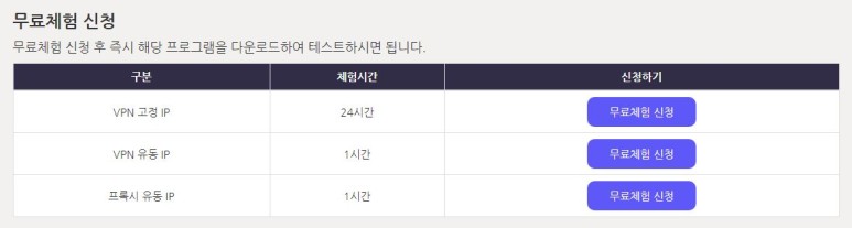 오른쪽에 ‘무료체험신청’이라고 하는 파란색 신청버튼을 클릭해서 신청을 완료하면 신청 즉시 무료체험이 시작되니 방금 내려받은 IPOU 전용 VPN에 로그인해서 무료 테스트를 해 보세요.