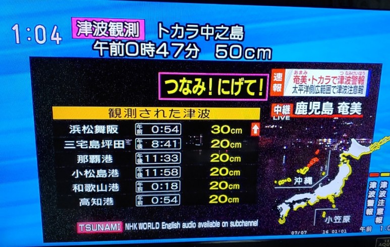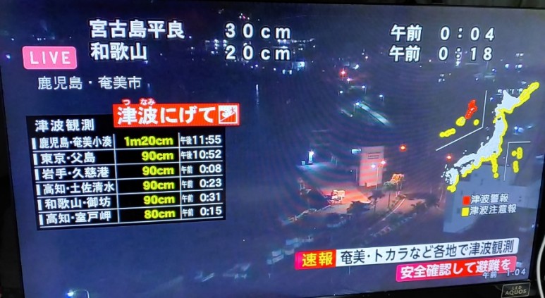 현재 위의 쓰나미의 높이 예상치보다 점점 일본에 도착하는 쓰나미의 규모가 높아지고 있으며, 가고시마 현의 아마미 섬은 최대 3미터로 예상되며, 일본 전역의 해안에 거주하는 분들은 쓰나미 재해 경보가 울려서 도망치라는 메시지가 잇따라 (5,10분 간격으로) 나오고 있습니다.