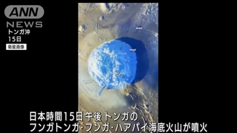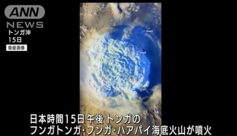 위성사진으로 본 통가하아 파이 해저화산 폭발시의 모습, 출처, ANN일본방송