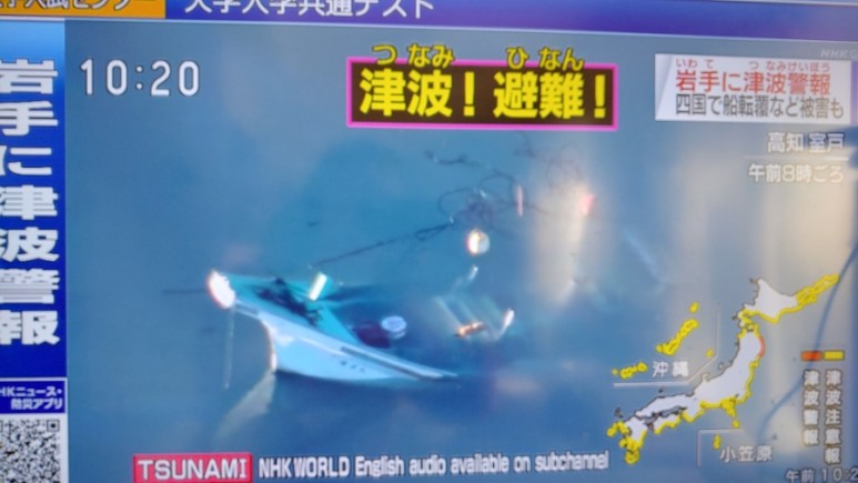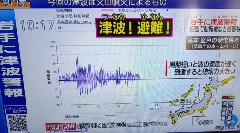 한국의 동해에 가까운 일본 서쪽 해안 일부를 제외하고 태평양 해류의 영향을 받는 일본 전국 대부분에서는 통가 해저폭발로 인한 해일 경보가 계속되고 있으며,