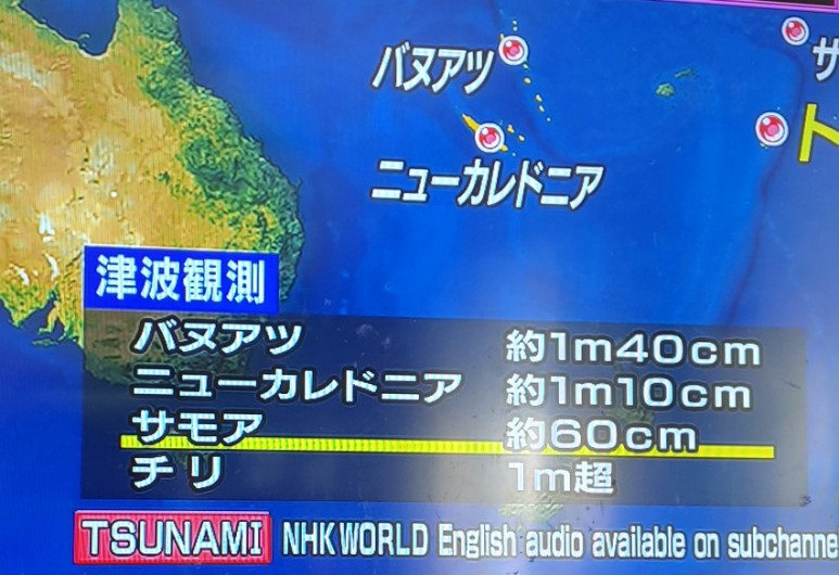 바노바 약 1m40cm 뉴칼레도니아 약 1m10cm 사모아 약 60cm 칠레 약 1m 이상 미국 캘리포니아도 쓰나미의 영향 중