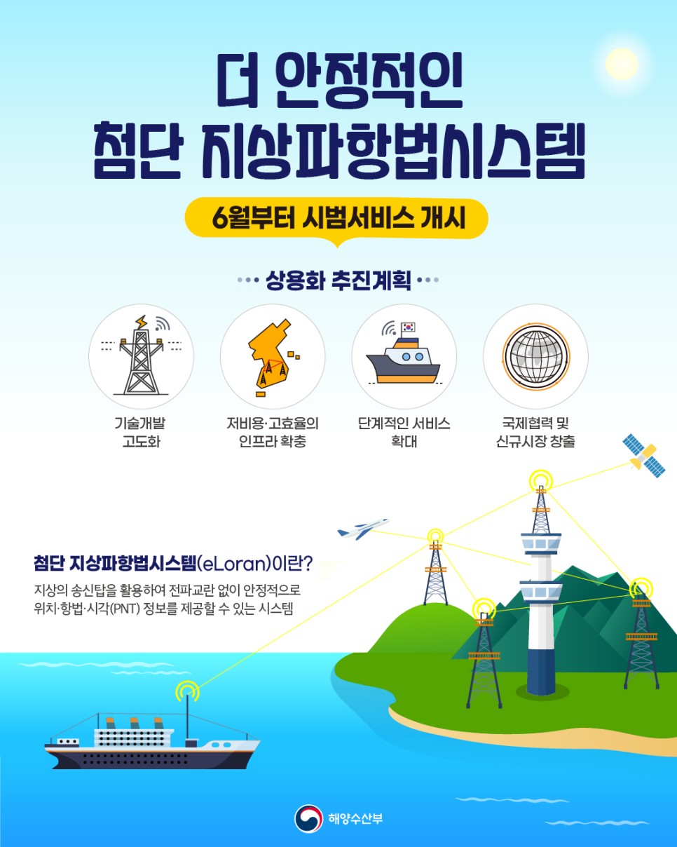 위성항법시스템의 취약성을 보완하고 국가보조위치·항법·시각(이하 PNT, Positioning Navigation Timing) 서비스를 제공하기 위한 『첨단지상파항법시스템(이하 eLoran*) 상용화 추진계획』을 발표했습니다! *(enhanced Longrangenavigation) 지상 3곳 이상의 송신국에서 발사된 전파 도달 시간을 측정하여 위치를 계산하고 정밀한 시각 정보도 제공할 수 있는 시스템