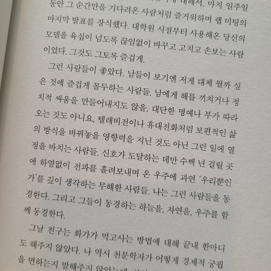 그런 사람들이 좋았어 다른 사람들이 보기에는 저게 도대체 뭘까 하는 일에 즐겁게 몰두하는 사람들. 남에게 해를 끼치거나 정치적 다툼을 야기하지 않는, 힘든 생명에 부가 따라오는 것도 아니고, TV나 휴대전화처럼 보편적인 삶의 방식을 바꾸는 영향력을 가진 것도 아닌, 그런 것에 열정을 바치는 사람들. (생략)