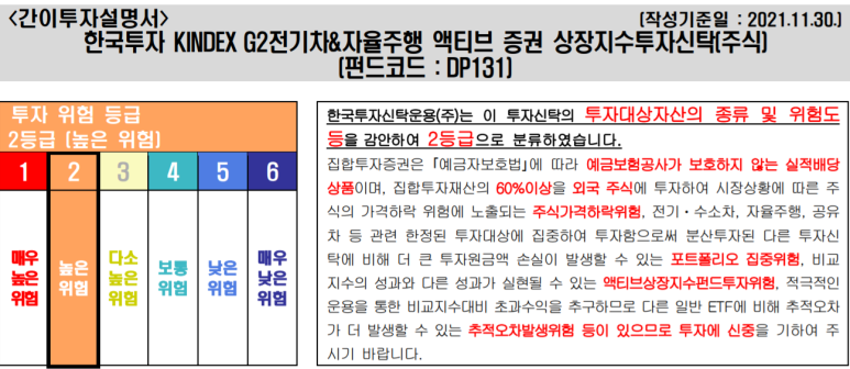 액티브 ETF란 단지 지수에 추종하는 것 이외에 관련 기업에의 직접투자도 아울러 실시할 수 있습니다.그러니까 위험도가 비교적 높은 ETF예요이 투자신탁은 투자신탁을 운용하는 담당 매니저의 재량으로 운용되는 투자신탁이며 지수의 성과와 다른 성과를 이룰 수 있다”고 투자설명서에도 적시돼 있다.High Risk High Return 고수익에는 고위험이 따르기 마련입니다.그래서 투자설명서의 리스크 클래스를 보면 2단계 높은 리스크에 속합니다.