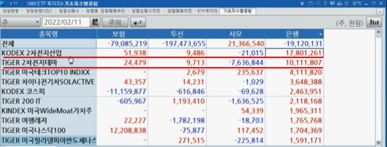 출처 : 삼프로TV의 유튜브 화면 발췌가 KODEX 2차전지산업과, TIGER 2차전지 테마 ETF 입니다. 다른 기업들도 마찬가지겠지만 은행은 자금을 운용해 이익을 창출하는 곳입니다. 은행들이 이렇게 많은 ETF 주식을 사는 이유도 돈이 될 테니 사는 거겠죠.