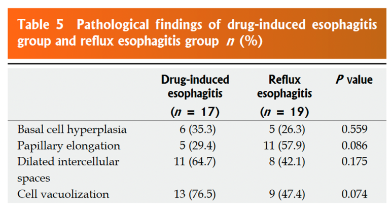 조직학적 소견약제 유발식도염의 조직검사 소견은 역류성 식도염과 크게 다르지 않았고 다소 비특이적인 소견일 뿐이었습니다. 그러나 내시경 소견만으로는 감별할 수 없기 때문에 조직 검사에서 다른 질병과 감별하는 것이 매우 중요합니다.
