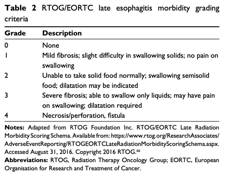 방사선에 노출된 후 수주 혹은 수개월이 지나 섬유화, 협착과 같은 합병증이 발생하는데 이에 대한 RTOG/EORTC grading 체계로 협착 정도를 나타냅니다.